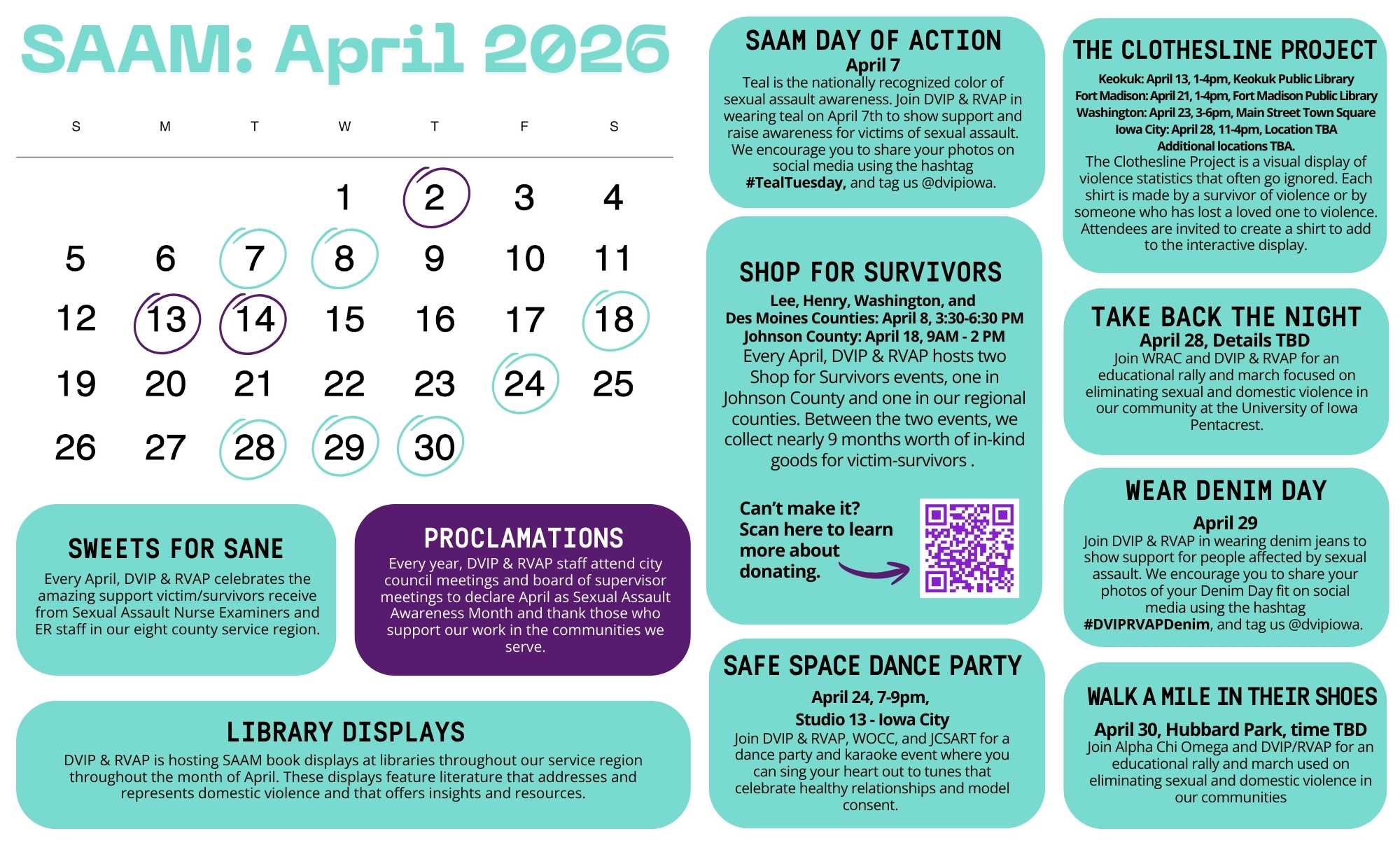 SAAM is a reminder that sexual assault is a critical issue that affects individuals and families in every community. Your involvement—whether through volunteering, donating, or using this month to raise awareness in your own way—makes a huge difference in the lives of victim-survivors. We invite you to stand with DVIP & RVAP this April and beyond as we work together to create safer, more supportive communities in southern Iowa.